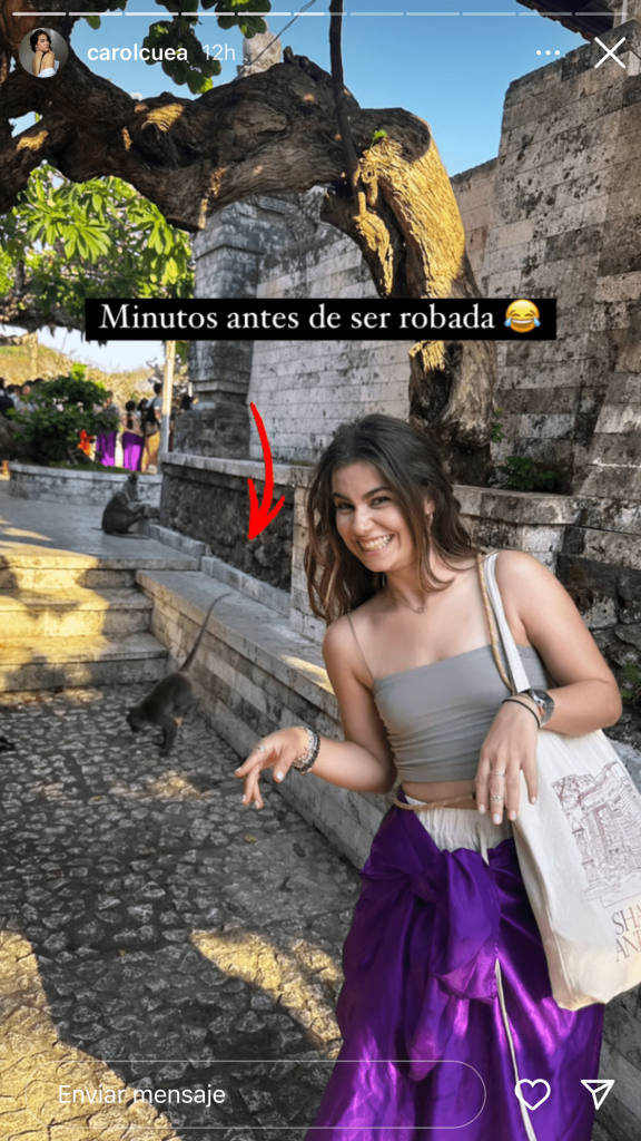 Carolina relató que esta curiosa anécdota tuvo lugar mientras visitaba el famoso templo Uluwatu en Bali, donde a pesar de no estar convencida de acercarse a una zona para tener una mejor vista del atardecer, lo hizo, «Yo tengo que hacerle caso a mi instinto».
