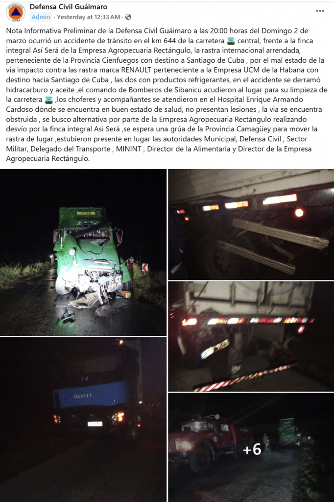 Un ejemplo reciente es el choque ocurrido entre dos rastras en la Carretera Central, en el tramo que corresponde a la provincia de Camagüey. El incidente, atribuido al mal estado de la vía, provocó un derrame de hidrocarburos y aceite, aunque afortunadamente no hubo víctimas mortales. ​