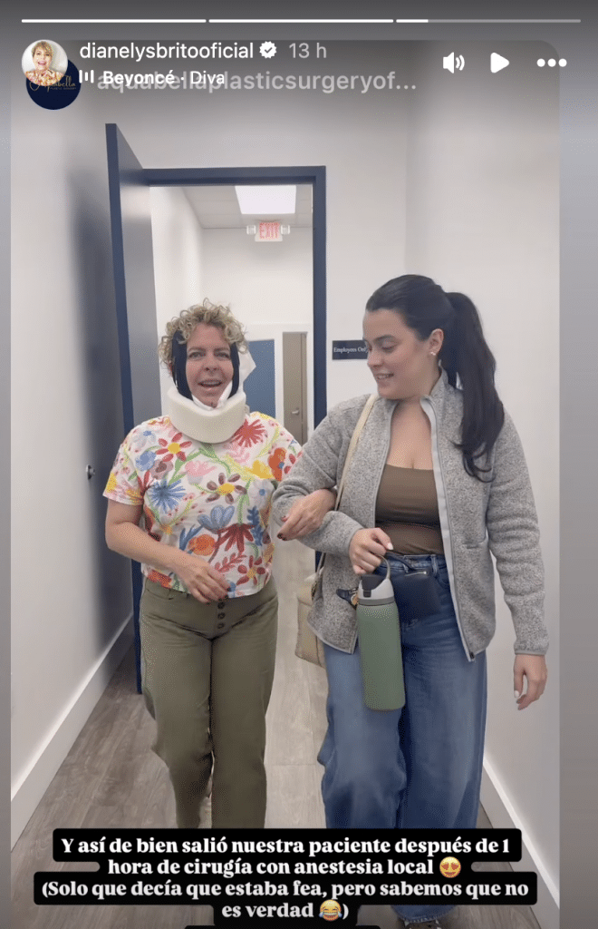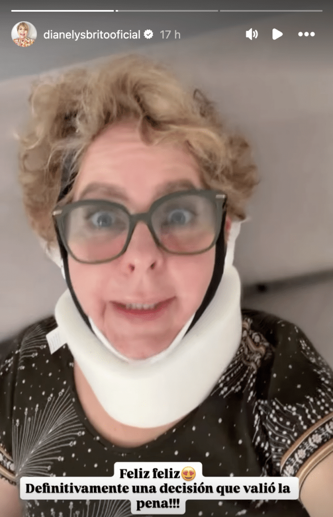 En una de sus historias, Brito apareció con el rostro vendado y un corsé de minerva en el cuello. “Parezco un astronauta con esto puesto”, bromeó, antes de añadir que, pese a lo aparatoso de la recuperación, está encantada con el resultado inicial: “Me acabo de hacer mi procedimiento, divino, espectacular, precioso, ya me vi el cuello y parezco un cisne”.