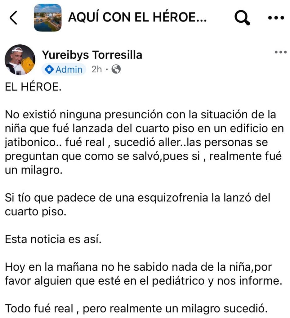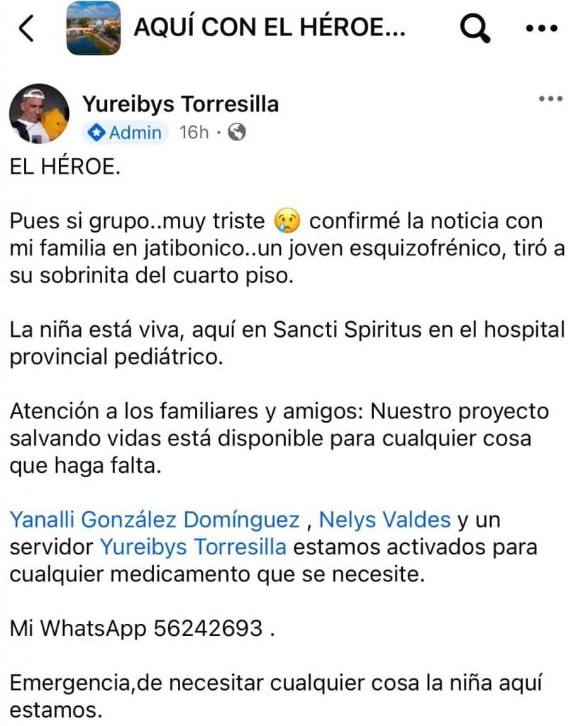 Varias publicaciones en grupos locales de Facebook aseguraron que “milagrosamente” la pequeña, que al parecer se llama Nathaly, sobrevivió a la caída y fue trasladada al Hospital Pediátrico Provincial José Martí Pérez.