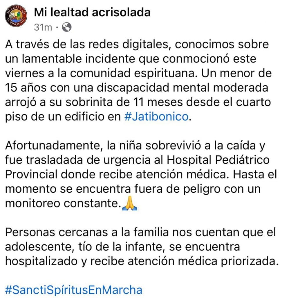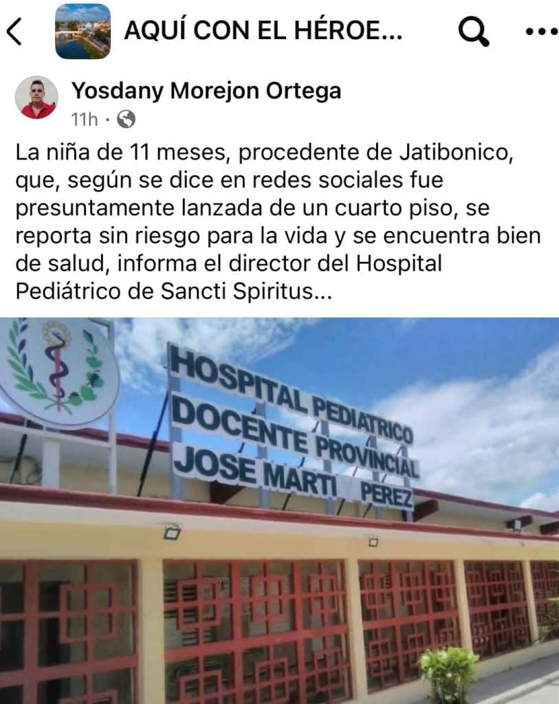 El usuario Yosdany Morejón Ortega dijo que el director de la institución aseguró que la bebé se encuentra “bien de salud” y “sin riesgo para la vida”.