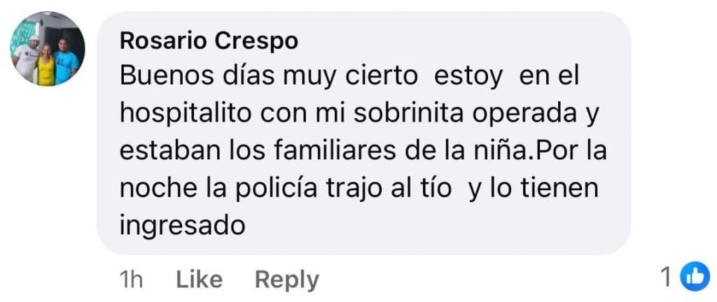 La internauta Rosario Crespo confirmó que el hecho es “muy cierto”. “Estoy en el hospitalito con mi sobrinita operada y estaban los familiares de la niña. Por la noche la policía trajo al tío y lo tienen ingresado”, comentó.