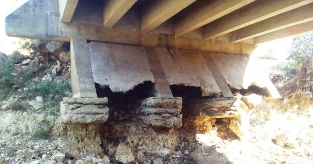 En concreto, existe una “socavación de cimientos en ambos estribos a todo lo ancho del puente” y una “pérdida de relleno de los aproches con hundimiento de la calzada en la vía”, que hacen al puente “altamente susceptible al colapso bajo el peso de vehículos pesados”.