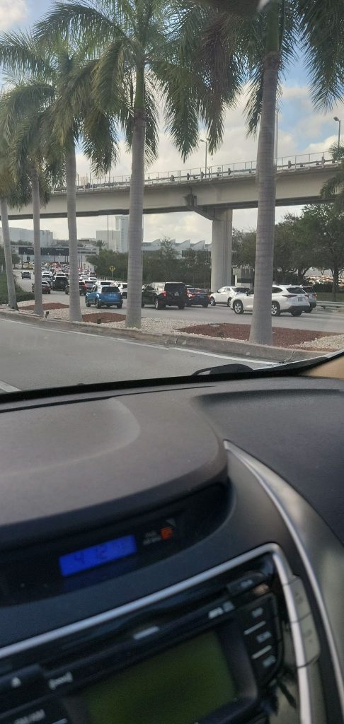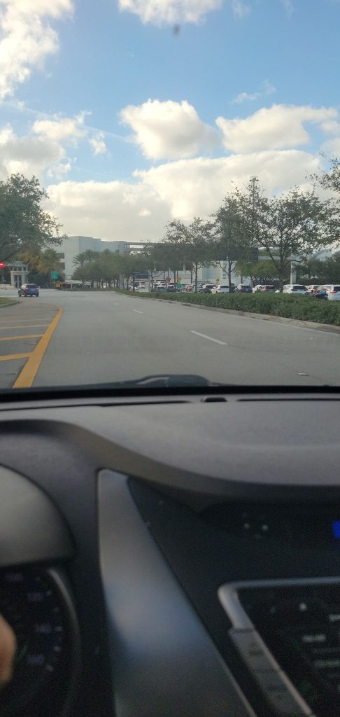«La cola practicamente no avanzaba. Así que entré y parquée. Solo pude encontrar parqueo en el 5to piso.» El aeropuerto de Miami tiene, en el llamado Parqueo Flamingo – hay otros – seis pisos.
