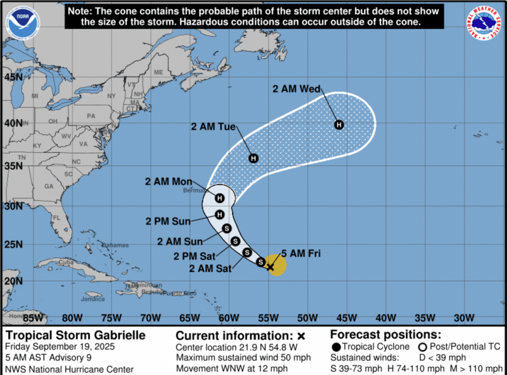 A las 09:00 UTC del viernes 19 de septiembre, el Centro Nacional de Huracanes (NHC) situó el centro de la tormenta en 21.9°N, 54.8°O, con vientos máximos sostenidos de 45 nudos (alrededor de 50 mph) y movimiento oeste-noroeste a 10 nudos. Es decir: tormenta tropical organizada pero todavía modesta, en el Atlántico central y lejos del continente.