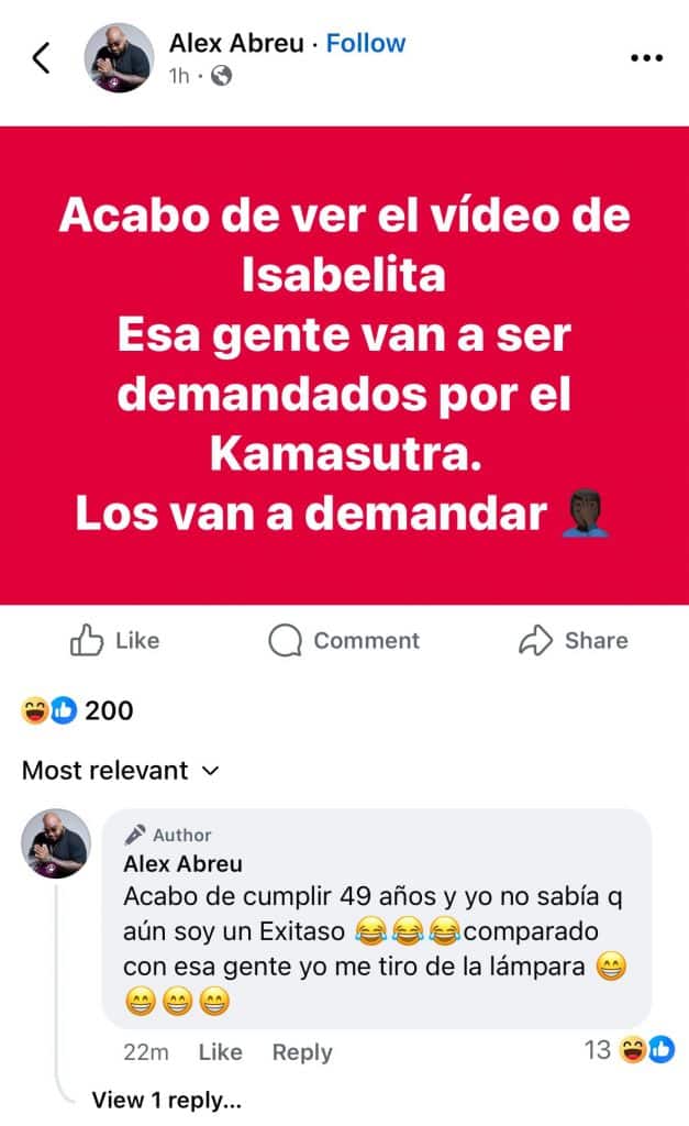 “Acabo de ver el video de Isabelita. Esa gente van a ser demandados por el Kamasutra. Los van a demandar”, escribió este martes el cantante, compositor y arreglista en su perfil de Facebook, después de ver las imágenes cuyo contenido ha sido la comidilla de los últimos días.