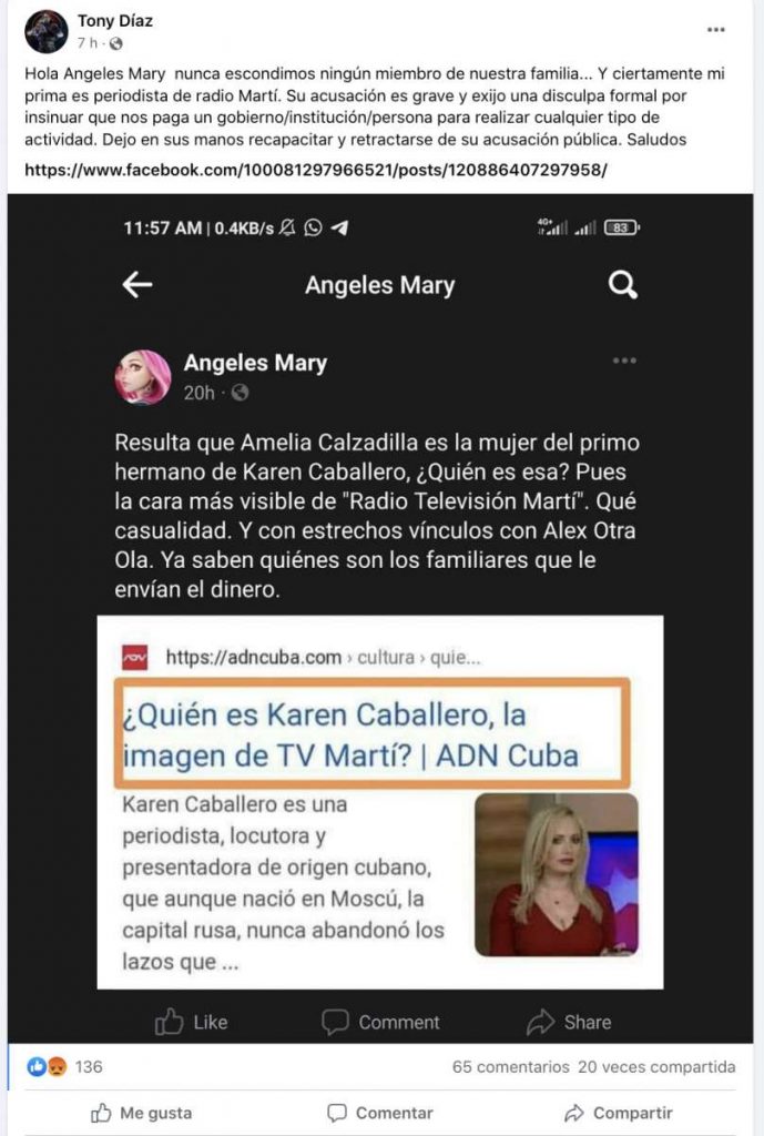 «Nunca escondimos ningún miembro de nuestra familia…,» dijo al referirse a su parentesco con Karen Caballero, y ciertamente mi prima es periodista de Radio Martí. Su acusación [en alusión a la publicada en un perfil que se identifica como Ángeles Mary] es grave y exijo una disculpa formal por insinuar que nos paga un gobierno/institución/persona para realizar cualquier tipo de actividad«, expresó Díaz. Angeles Mary es, sin embargo, un perfil falso.