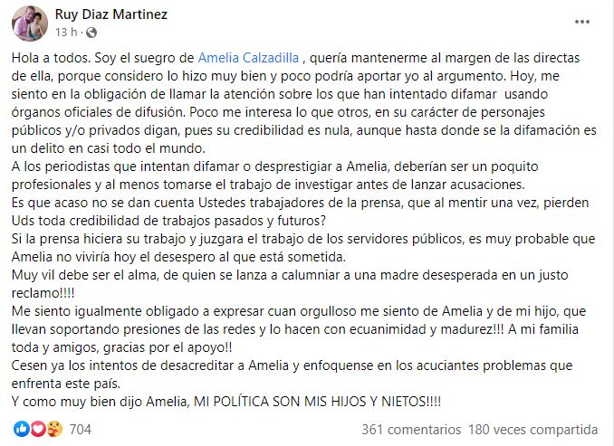 «A los periodistas que intentan difamar o desprestigiar a Amelia, deberían ser un poquito profesionales y al menos tomarse el trabajo de investigar antes de lanzar acusaciones», dijo Ruy Díaz Martínez, el suegro de Amelia Calzadilla en defensa de la joven.