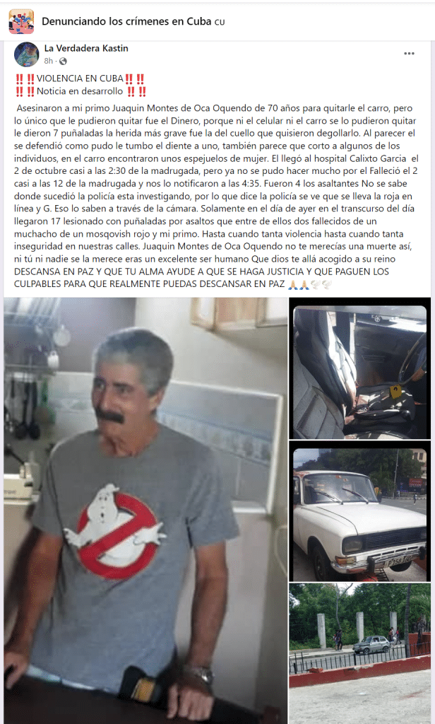 Un cubano denunció en redes sociales que el pasado 2 de octubre su primo, Juaquin Montes de Oca Oquendo, un septuagenario, fue brutalmente asesinado a manos de presuntamente 4 individuos que intentaron robarle su auto.