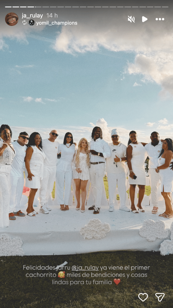 Este 12 de enero, Ja Rulay publicó en sus historias de Instagram varias imágenes del baby shower que organizaron para celebrar la llegada de su primogénito. El evento, lejos de cualquier exceso, respiró ternura por cada rincón. La decoración apostó por tonos claros, globos, nubes y unas enormes letras que decían “Baby Álvarez”, anticipando el apellido que llevará el nuevo integrante de la familia. En las fotos se aprecia a la pareja vestida completamente de blanco, rodeada de familiares, amistades cercanas y colegas del género urbano que no quisieron perderse este capítulo tan especial.