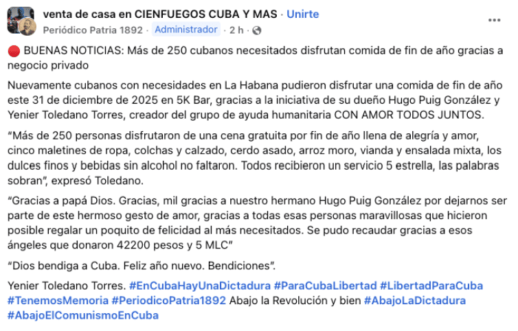 La historia circuló en Facebook, Instagram y medios independientes como una “buena noticia”, y lo es. Pero también es una noticia dura: para que 250 personas encuentren una cena de fin de año gracias a un emprendimiento y a un grupo voluntario, hace falta que esas 250 personas existan, estén visibles y no tengan otra puerta. Lo que se celebró en Guanabo fue, al mismo tiempo, un acto de comunidad y una evidencia: la Isla está entrando a otro ciclo donde la caridad organizada, la iniciativa privada y las redes de apoyo están haciendo tareas que antes se vendían como garantizadas.
