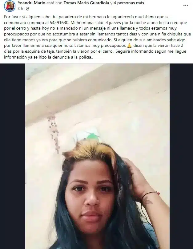 Esto se conoció ayer miércoles, cuando su hermano, Yoandri Marín, solicitó ayuda a través de redes sociales para localizarla, mencionando que no es habitual que ella pierda contacto por tanto tiempo, especialmente teniendo una hija pequeña. Los ultimos avistamientos reportados de la joven fueron en la Esquina de Tejas y El Cerro. La familia ya ha presentado una denuncia ante la policía.