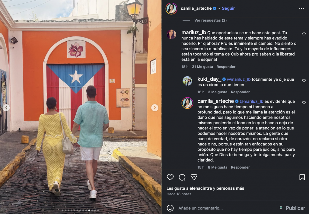 Camila Arteche responde a fan que la llamó “oportunista” por pedir libertad para Cuba desde Puerto Rico
