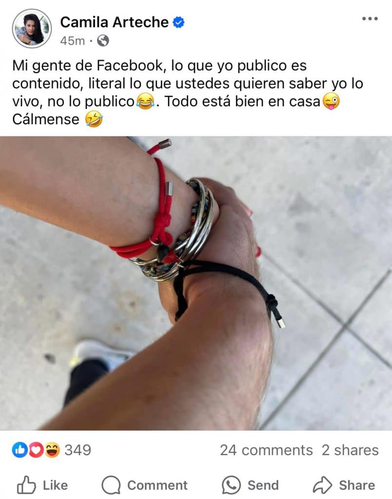 “Mi gente de Facebook, lo que yo publico es contenido, literal. Lo que ustedes quieren saber yo lo vivo, no lo publico. Todo está bien en casa. Cálmense”, escribió la también influencer al pie de una fotografía de su mano entrelazada con la de su pareja, un chico “misterioso” al que hasta el momento no ha querido presentar ante sus miles de seguidores.