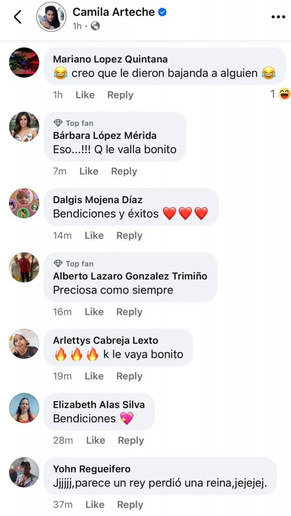 “Es que nos gusta el chisme y tú tienes tremenda intriga con tu novio. Queremos saber quién es. Espero que no sea primo del hijo de Liz Cuesta ni sobrino de Canel. No nos hagas eso, Camilita. Love U”, opinó otra fan de la actriz de manera jocosa.