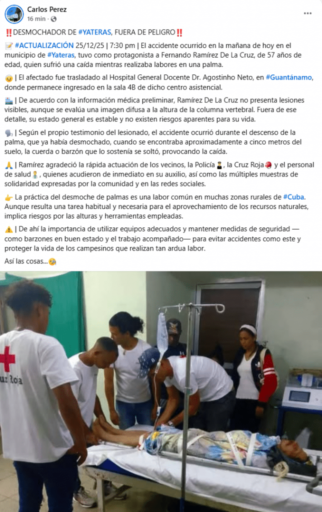 Horas después, se conoció que el accidentado es Fernando Ramírez de la Cruz, de 57 años de edad, quien permanece ingresado en el Hospital General Docente Dr. Agostinho Neto, en la ciudad de Guantánamo. De acuerdo con informaciones médicas preliminares, el paciente se encuentra fuera de peligro, con estado general estable y sin lesiones visibles de gravedad, aunque los especialistas continúan evaluando una imagen difusa detectada a nivel de la columna vertebral como parte de los exámenes de control.