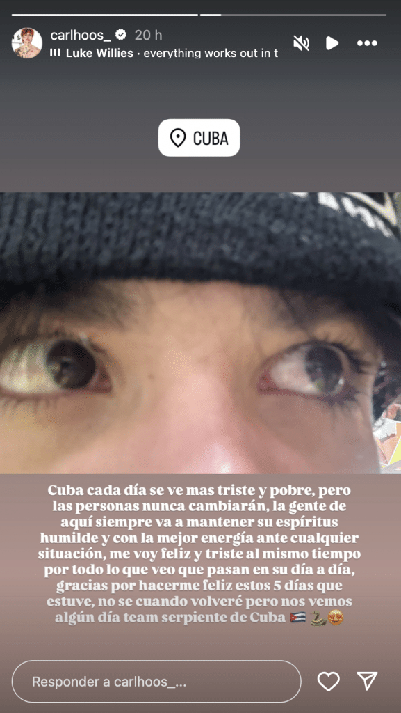 En una historia de Instagram, compartió una reflexión que condensó lo que sintió durante su visita: “Cuba cada día se ve más triste y pobre, pero las personas nunca cambiarán, la gente de aquí siempre va a mantener su espíritu humilde y con la mejor energía ante cualquier situación”, escribió junto a una foto en la que aparece profundamente conmovido.