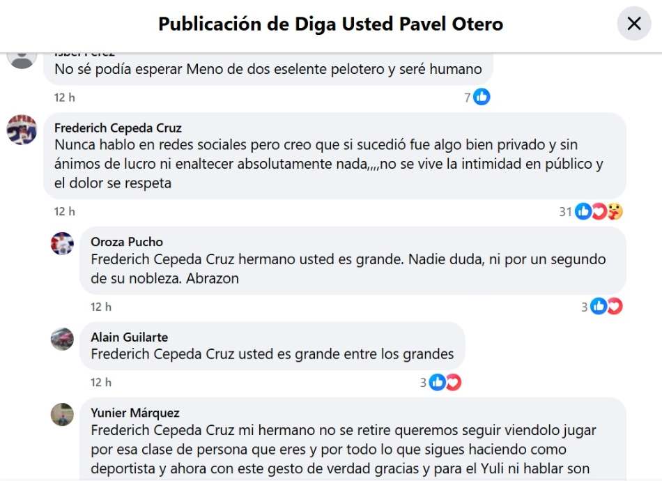 “Si han sido admirados por ser grandes leyendas del béisbol cubano, ahora lo serán más todavía por ese gran gesto de ambos”; “Cepeda y El Yuli sirven de ejemplo con sus amigos en épocas bajas y eso vale más que la gran pelota que jugaron los dos”; y “Si como peloteros son inmensos, lo son muchísimo más como seres humanos”, comentaron algunos usuarios sobre el gesto.