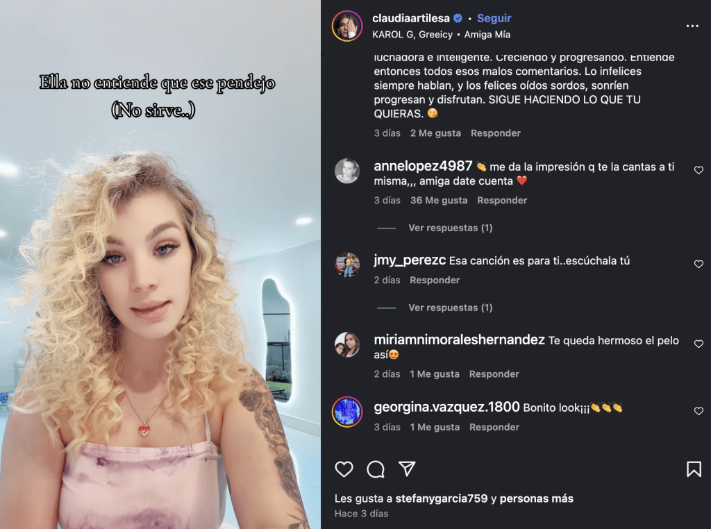 Un simple video bastó para desatar una tormenta. Claudia Artiles, influencer cubana con miles de seguidores en Instagram, se atrevió a cantar el tema “Amiga mía”, una colaboración de Karol G y Greeicy cargada de indirectas y verdades incómodas sobre relaciones tóxicas. Pero lo que quizás comenzó como un contenido inocente, terminó con su sección de comentarios convertida en un campo de batalla digital.