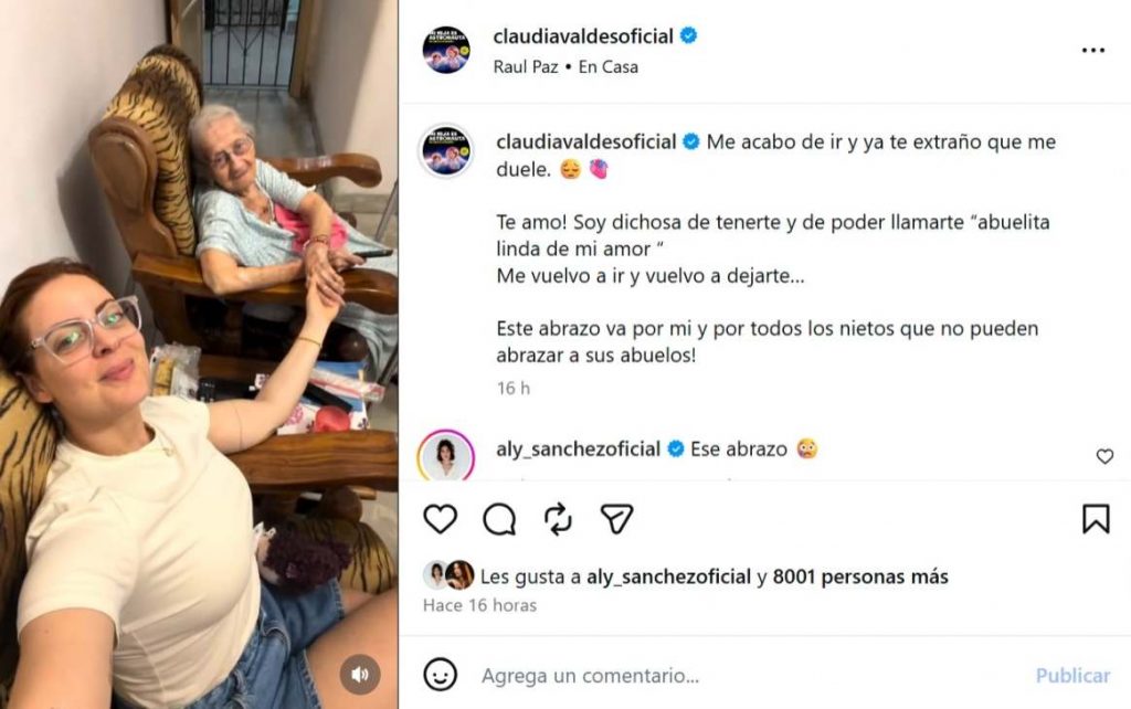 “Me acabo de ir y ya te extraño (tanto) que me duele. ¡Te amo! Soy dichosa de tenerte y de poder llamarte ‘abuelita linda de mi amor’. Me vuelvo a ir y vuelvo a dejarte”, escribió en redes sociales la también esposa del comediante, actor y director cubano Alexis Valdés, que desde hace años regresa a Cuba para ver a su abuela cada vez que puede.