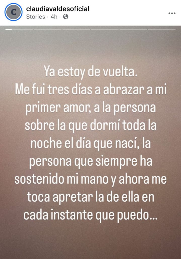 “Ya estoy de vuelta. Me fui tres días a abrazar a mi primer amor, a la persona sobre la que dormí toda la noche el día que nací, la persona que siempre ha sostenido mi mano y ahora me toca apretar la de ella en cada instante que puedo”, detalló Valdés a través de sus historias apenas regresó a Miami.
