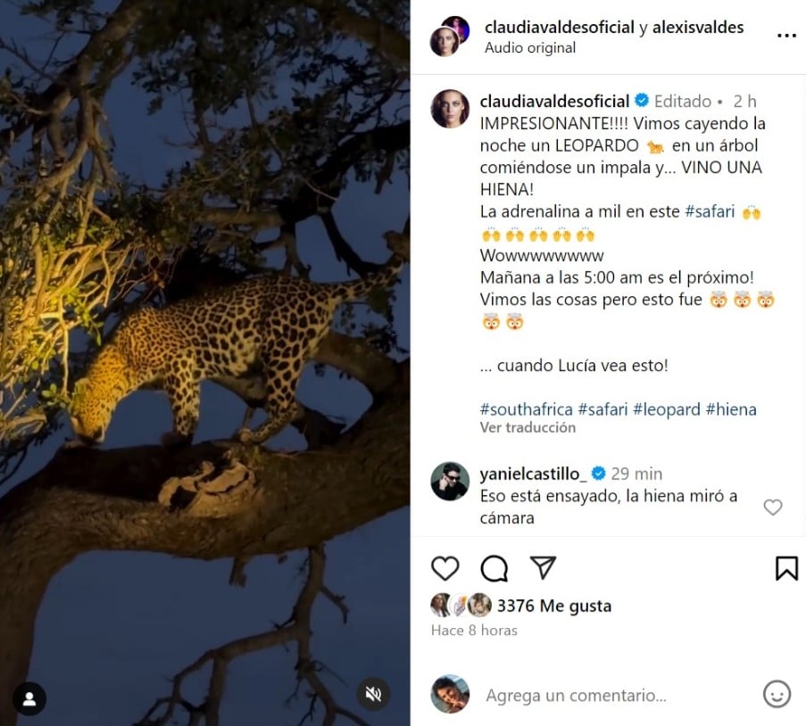 Según contó Claudia en su perfil de Instagram, ha sido “lo más impresionante del mundo” ver a un leopardo comiéndose un impala en un árbol mientras caía la noche y la llegada luego de una hiena.