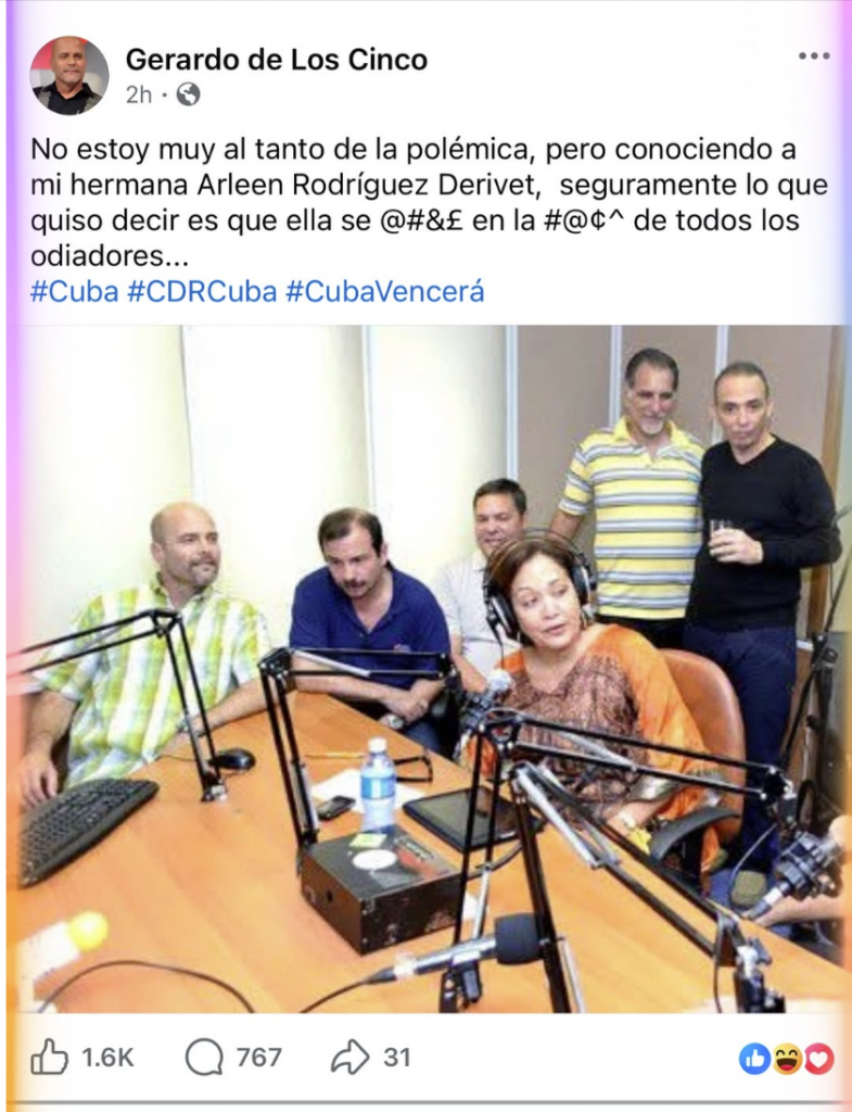 En un post publicado en sus redes sociales dijo no estar “muy al tanto de la polémica”, pero afirmó que, conociendo a “mi hermana Arleen Rodríguez Derivet”, lo que ella “quiso decir” es que “ella se @#&£ en la #@¢^ de todos los odiadores…”, rematando con etiquetas como #Cuba, #CDRCuba y #CubaVencerá.
