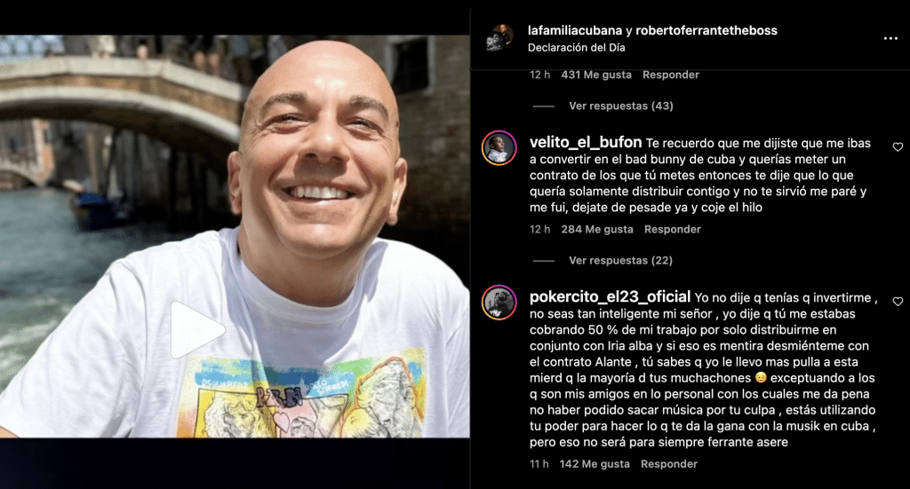 En un audio divulgado por la plataforma Familia Cubana, Ferrante dijo que se negó a firmar a Velito El Bufón porque “no le gustaban” sus productos musicales ni sus videos. “Le expliqué que, a pesar de que es buen cantante, a Planet Records no interesan los productos para pura distribución”, contó.
