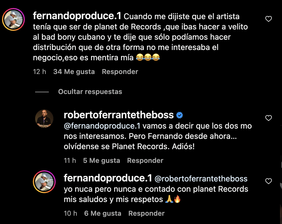 “Estoy obligado a aclarar algunas afirmaciones falsas de Velito El Bufón, Mamá Estoy Brillando y Pokercito respecto a mi persona y Planet Records. Planet Records nunca ha contactado a Velito El Bufón ni tampoco a Mamá Estoy Brillando”, dijo Ferrante, quien lleva la carrera de Bebeshito, Ja Rulay y Charly & Johayron.