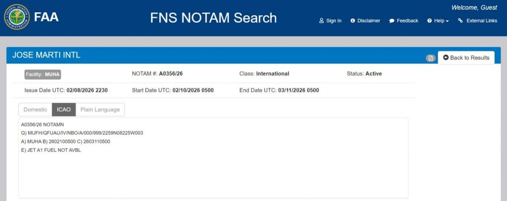 De acuerdo con esta notificación, que forma parte del sistema global de alertas aeronáuticas utilizado para informar a tripulaciones y aerolíneas sobre condiciones relevantes para la operación, las aeronaves no podrían repostar Jet A-1 en La Habana durante el período señalado.