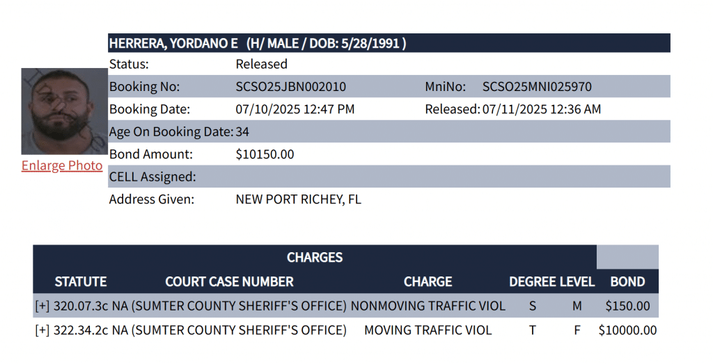 Herrera fue detenido y trasladado al Centro de Detención del Condado de Sumter. Fue imputado por dos cargos: conducir un vehículo con registro vencido por más de seis meses y manejar con una licencia suspendida por DUI, siendo esta la tercera violación de este tipo. Logró recuperar la libertad tras pagar una fianza de $10,150.