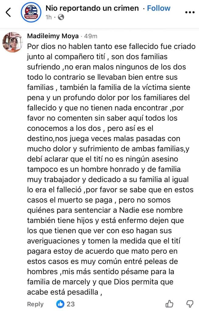 “No eran malos ninguno de los dos, al contrario, se llevaban bien entre sus familias. Toda la familia de la víctima siente pena y un profundo dolor por los familiares del fallecido”, comentó en la página de Nio reportando un crimen en Facebook una persona que al parecer conocía tanto a Serra como a su agresor.