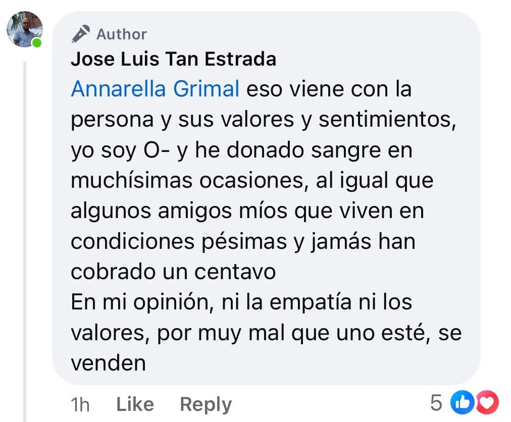 “Eso viene con la persona y sus valores y sentimientos. Yo soy O- y he donado sangre en muchísimas ocasiones, al igual que algunos amigos míos que viven en condiciones pésimas, y jamás han cobrado un centavo. En mi opinión, ni la empatía ni los valores, por muy mal que uno esté, se venden”, comentó el periodista independiente José Luis Tan Estrada, tras hacerse eco del lamentable hecho.