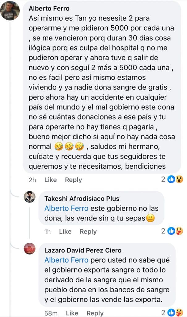 El usuario Alberto Ferro confirmó que este tipo de cosas pasan a diario en la Cuba de hoy, ya que él mismo necesitó dos donaciones para operarse y “me pidieron 5.000 por cada una”.