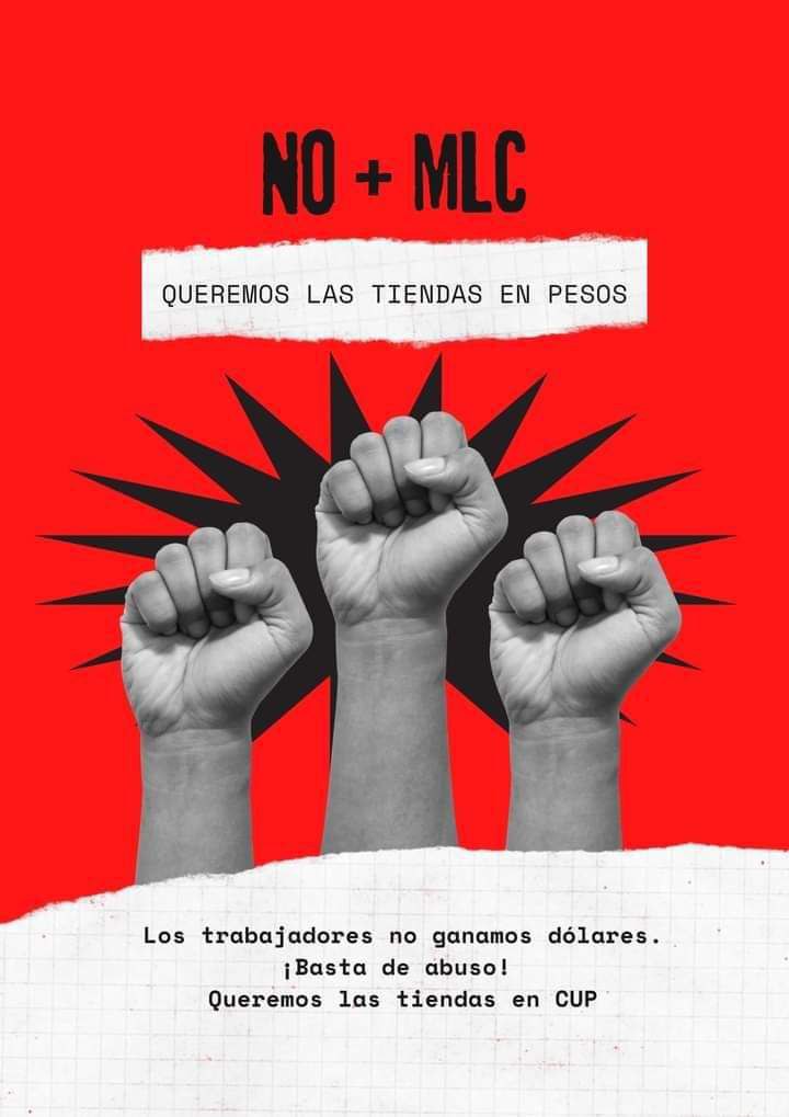 Asimismo, personas de distinta procedencia, muchos de ellos con afiliaciones a organismos estatales y del sector cultural comparten en sus redes la imagen donde se lee “NO + MLC. Queremos las tiendas en pesos. Los trabajadores no ganamos dólares. Basta de abuso. Queremos las tiendas en CUP”.