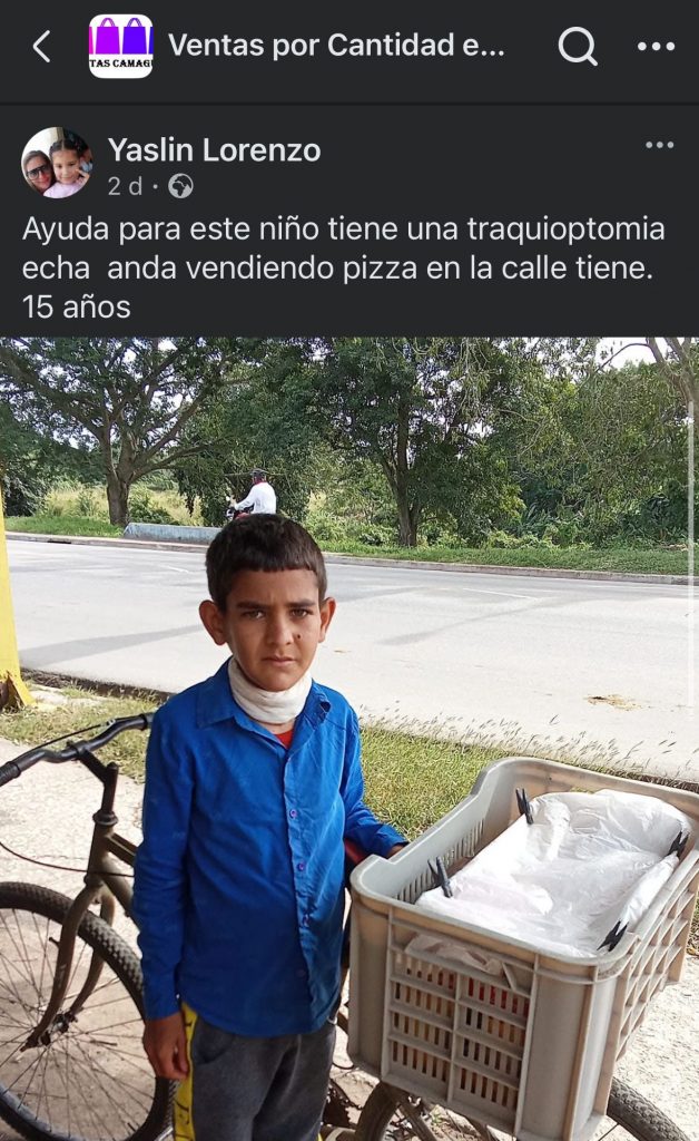 “Ayuda para este niño, tiene una traqueotomía hecha y anda vendiendo pizza en la calle, tiene 15 años”, escribía hace un par de días la usuaria Yaslin Lorenzo en el grupo de compraventa “Ventas por cantidad Camagüey”. En los comentarios y publicaciones posteriores, los vecinos del niño, que vive en el reparto Bella Vista, se unieron al pedido de ayuda y brindaron más detalles sobre su actual situación.