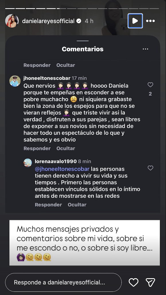 La chispa que encendió el tema fue un comentario que le dejaron sin anestesia: “Daniela, ¿por qué te empeñas en esconder a ese pobre muchacho? Ni siquiera grabaste bien la zona de los espejos para que no se vieran reflejos. Qué triste vivir así la verdad. Disfruten a sus parejas, sean libres de exponer a sus novios sin necesidad de hacer todo un espectáculo de lo que ya sabemos y es obvio”, escribió un internauta.