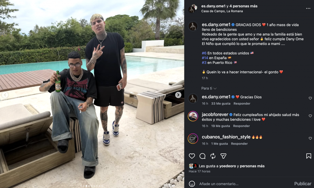 El hallazgo coincide con el cumpleaños 25 del integrante del dúo junto a Kevincito El 13. El propio Dany Ome compartió una foto en blanco y negro en sus historias de Instagram, vestido con gorra Hellstar, sudadera Balenciaga y sus clásicas cadenas gruesas.