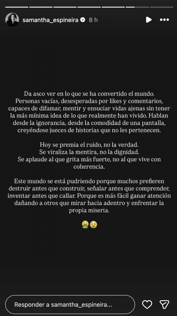 Hasta el momento, ninguna de las partes ha emitido nuevas declaraciones. Sin embargo, la postura de Samantha Espineira parece clara: marcar un límite. En una era donde todo se graba, se expone y se monetiza, su mensaje funciona como recordatorio de que no todo lo personal es público, y de que la verdad, aunque menos ruidosa, sigue teniendo valor.