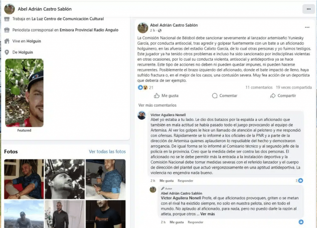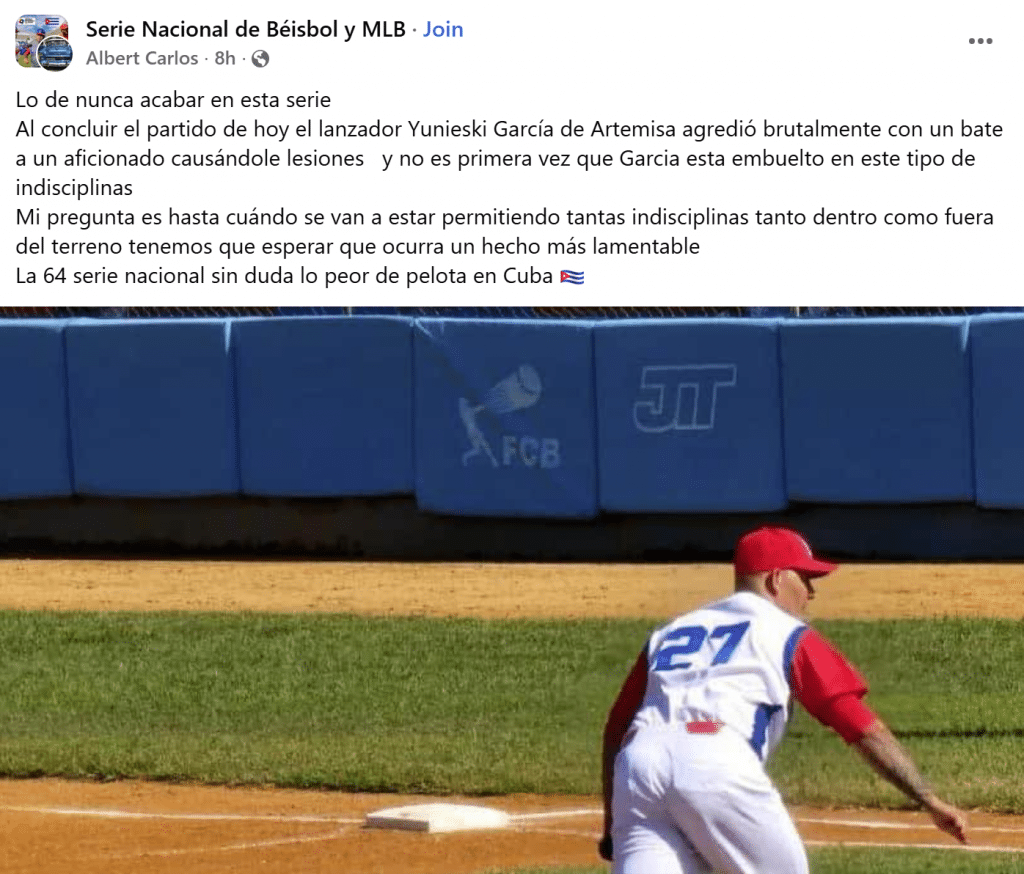 La postemporada de la 64 Serie Nacional de Béisbol en Cuba amaneció esta semana atravesada por una acusación grave que, por ahora, vive en el terreno movedizo de las redes: varias publicaciones en grupos de Facebook y páginas deportivas aseguraron que el lanzador de Artemisa Yuniesky García “agredió” con un bate a un aficionado holguinero al concluir un juego en el estadio Calixto García Íñiguez, en Holguín.