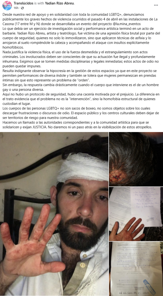 Un nuevo episodio de violencia contra una persona de la comunidad LGBTQ+ fue denunciado públicamente en Cuba tras los hechos ocurridos el pasado 4 de abril en La Casona, un espacio ubicado en 17 entre M y N, en La Habana, donde se desarrollaba un evento del proyecto La Mina. La acusación fue divulgada por la plataforma Translúcidos, que señaló como víctima al artista y teatrólogo Yadian Rizo Abreu.