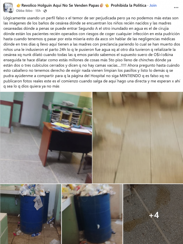 Una denuncia publicada en Facebook ha vuelto a poner el foco sobre las condiciones sanitarias en el Hospital Clínico Quirúrgico Vladimir Ilich Lenin, en Holguín, tras difundirse imágenes de baños colapsados, inundaciones y suciedad en áreas donde permanecen madres recién operadas y recién nacidos.