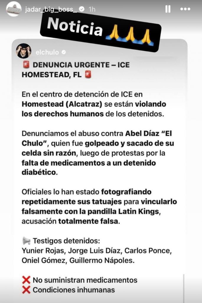 El equipo del reguetonero cubano Abel Díaz Rodríguez, más conocido como El Chulo, denunció este lunes la violación de derechos humanos en el centro de detención del Servicio de Inmigración y Control de Aduanas (ICE por sus siglas en inglés) en Everglades, Florida, conocido como Alligator Alcatraz o Alcatraz de los Caimanes.