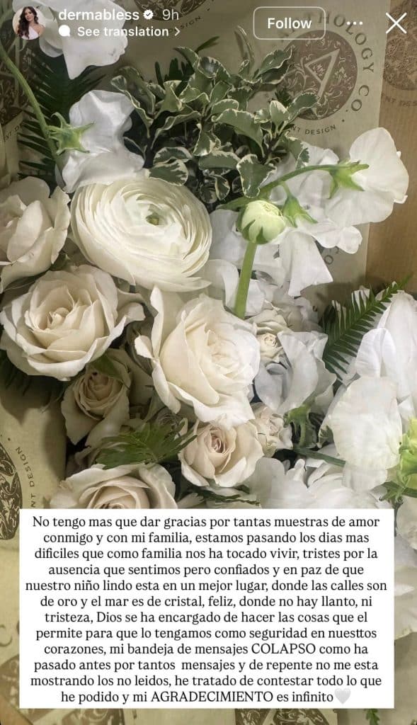 “Estamos pasando los días más difíciles que, como familia, nos ha tocado vivir. Tristes por la ausencia que sentimos, pero confiados y en paz de que nuestro niño lindo está en un mejor lugar, donde las calles son de oro y el mar es de cristal, feliz, donde no hay llanto, ni tristeza, Dios se ha encargado de hacer las cosas que él permite para que lo tengamos como seguridad en nuestros corazones”, escribió conmovida la fundadora del medspa Dermabless, cuya bandeja de mensajes colapsó por las muchas muestras de cariño que ha recibido.