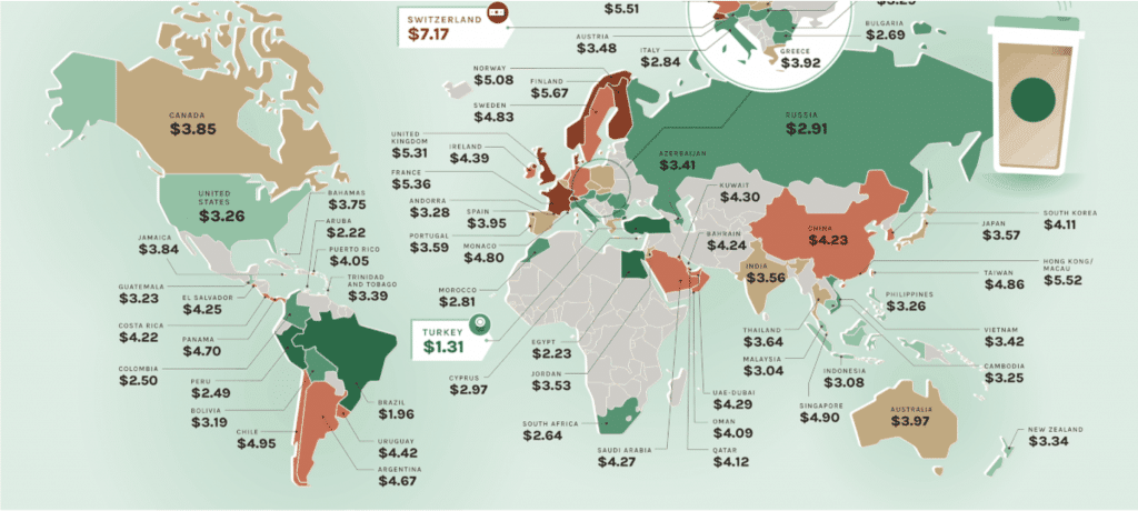 Según indica Visual Capitalist en su mapa – donde por cierto, Cuba no aparece ni por todo eso – el café Starbucks más caro del mundo no se compra en Rusia, sino en Suiza.