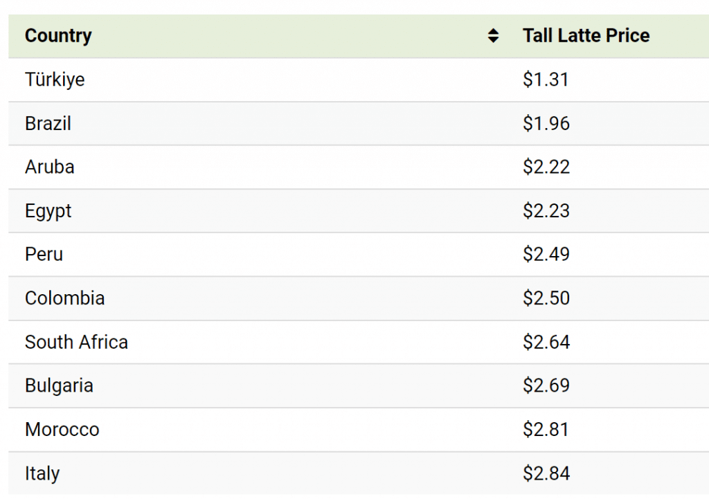 Otros países donde el café Starbucks cuesta por debajo de los $3 dólares son: Brasil, Aruba, Perú, Colombia y Marruecos.