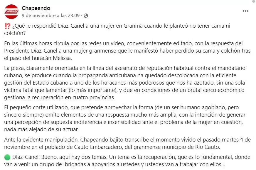 El intento de apuntalar la imagen de Miguel Díaz-Canel, tras su desafortunada respuesta a una damnificada del huracán Melissa, ha terminado en un boomerang propagandístico.