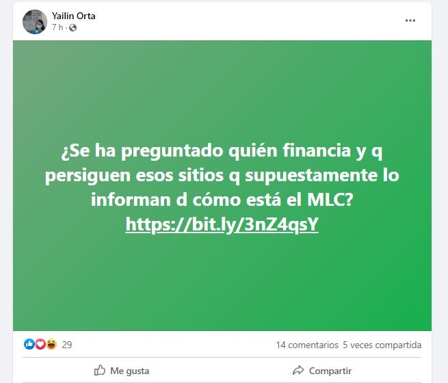 «Se observa la tendencia a la publicación arbitraria y manipulada de tasas de cambio en los medios financiados desde el exterior, así como de informaciones falsas, las cuales han sido desmentidas por nuestros medios de comunicación y en sitios institucionales. ¿Se ha preguntado quién financia y q persiguen esos sitios q supuestamente lo informan d cómo está el MLC? ¿Acaso cree en la bondad de los mismos que nos bloquean e impiden que, desde su territorio, un padre mande remesas a sus hijos, o un hijo a su madre?,» expresó Yailín Orta.