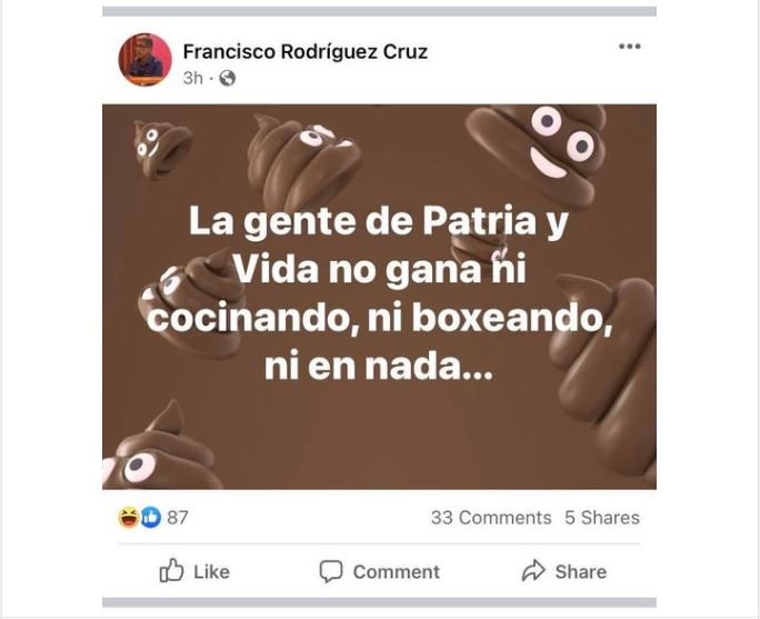 Dijo, mientras el acompañamiento visual en el que se apoyaba mostraba unos horrendos dibujos racistas cargados de odio en contra del boxeador Yordenis Ugas, que Ugas era un perdedor. Mostraba además un horrendo post – cargado de odio también – del periodista Francisco Rodríguez Cruz.