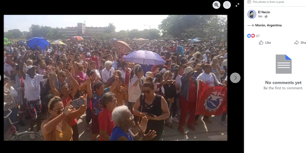 Al compartir la noticia del acto partidista en Ciego de Ávila, activó la geolocalización del evento en Facebook. Pero en lugar de situar la foto —que algunos aseguran que está manipulada y otros sostienen que muestra asistencia real, aunque forzada— en Morón, Ciego de Ávila, la ubicó en Morón, Argentina. El resultado fue que volvió a quedar en ridículo, exactamente como lo que es: un Necio.